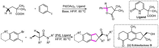 In 2023, Yu’s group achieved double γ-C(sp3)–H activation of linear free carboxylic acids under palladium catalysis, along with intramolecular cyclization (Scheme 30) [55]. The coordination of amido-type ligands was key to the success of this reaction, stabilizing the reactive intermediate. In the same year, Yu’s team reported [3 + 2] cyclization involving double β-C(sp3)–H activation under palladium catalysis, representing a crucial step in synthesizing the natural product (±)Echinolactone D (Scheme 30) [56].