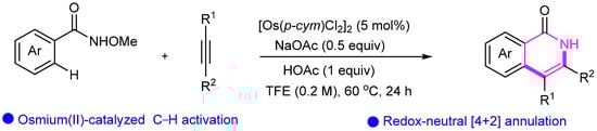 - Yang, J.; Wu, L.; Xu, H.; Gao, H.; Zhou, Z.; Yi, W. Redox-Neutral [4 + 2] Annulation of N-Methoxybenzamides with Alkynes Enabled by an Osmium(II)/HOAc Catalytic System. Org. Lett. 2019, 21, 9904–9908. [Google Scholar] [CrossRef]
