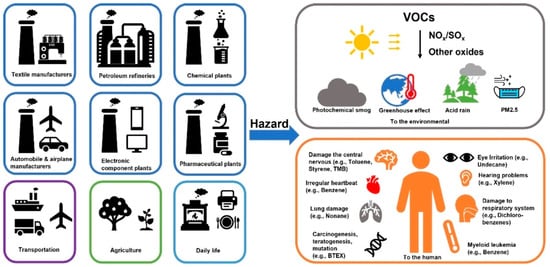 Main sources of VOC emissions and associated hazards to humans and the environment. Reproduced from [10]. This is an open access article distributed under the Creative Commons Attribution License.