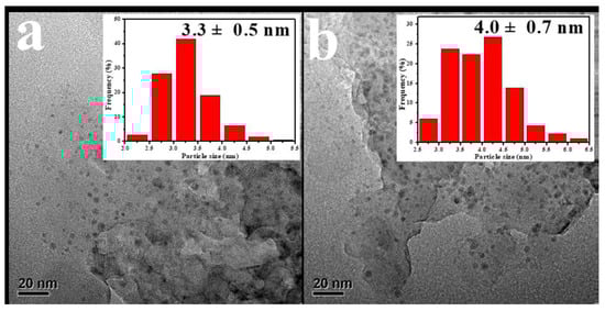TEM images and the corresponding histograms of Pt NPs distribution (insets) of (a) bio-Pt/eggshell and (b) chem-Pt/eggshell. Reproduced with permission from [106]. Copyright (2020) American Chemical Society.