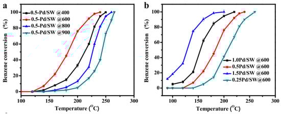 Complete benzene conversion over Pd/SW (shrimp waste) catalysts calcined at diverse temperatures (a); with diverse Pd loadings (b). Reproduced with permission from [124]. Copyright (2020) American Chemical Society.