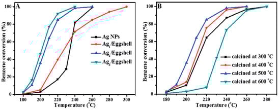 Temperature dependence of benzene conversion over (A) pure Ag NPs and Agx/eggshell catalysts (x = 10.8, 19.9, and 34.3 wt.%) and (B) effect of calcination temperature of Ag2/eggshell at GHSV of 20,000 mL·g–1·h–1. Reproduced from [175] with permission from the Royal Society of Chemistry.
