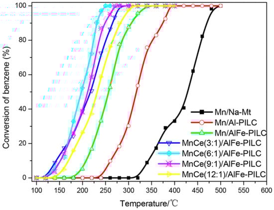 Preparation of MnO2/NiO composites was reported as an effective approach to benzene low-temperature catalytic abatement [208,209,210]. Modification of MnO2 by Sm [211], Sn [212], and Sr [213] was another successful strategy for excellent benzene oxidation performance. Zuo et al. used AlFe-pillared clay as a perspective porous material for impregnation with Mn and Ce nitrate solution to produce a catalyst with 10 wt.% total amount of Mn or MnCe and Mn/Ce atomic ratios of 3:1, 6:1, 9:1, and 12:1 [214]. The authors discussed the effect of CeO2 addition on MnOx dispersion and formation of an optimum number of oxygen vacancies for high and stable benzene oxidation at relatively low temperatures. Catalytic performance of catalysts with various compositions is shown in Figure 8. Mn-Ce(6:1)/AlFe-pillared clay demonstrated the highest activity and ability to completely degrade benzene at about 250 °C.