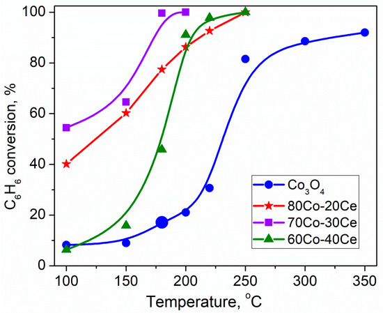 Comparison of benzene conversion over Co3O4 and Co-Ce mixed oxides. Reproduced from [220]. This is an open access article distributed under the Creative Commons Attribution License.