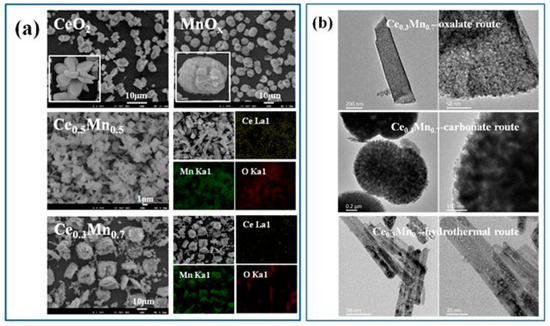 SEM images and EDX mapping of CeO2, MnOx, Ce0.5Mn0.5 and Ce0.3Mn0.7 (a); TEM images of Ce0.3Mn0.7 synthesized through different routes (b). Reproduced from [232]. This is an open access article distributed under the Creative Commons Attribution License.