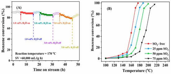 Many studies deal with composite Mn oxides because of their excellent catalytic activity related to synergistic effects, formation of more oxygen vacancies, and improved mobility of surface oxygen. Extensive research has been conducted for preparation of Mn-Cu mixed oxide catalysts with enhanced benzene combustion performance [188,189,190,191,192,193,194,195,196,197]. Generally, addition of copper to manganese oxide contributed to higher surface area [189,190,192,194], increased oxygen vacancy concentration [188,191,192,196,197], abundant surface-adsorbed oxygen species [189,191,194,196], and improved low temperature reducibility [189,190,191,197]. Because of high oxygen mobility, Co3O4 was also found to be an attractive additive. Adsorbed oxygen species and low-temperature reducibility of Mn–Co mixed oxide nanorods prepared by the sol-gel chelating method associated with strong synergistic effect between Mn and Co species in solid solution positively affected benzene conversion [198]. Creation of an MnO2-Co3O4 heterogeneous interface was achieved by decoration of three types of 1D MnO2, thus facilitating formation of surface active oxygen and improving low temperature reducibility [199]. Suitability of diatomaceous earth as a novel, cheap, and widely available support of MnO2-Co3O4 catalysts able to completely decompose benzene in the temperature range 225–250 °C was demonstrated [200].