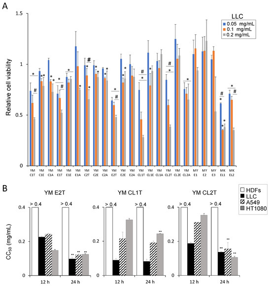 Out of twenty-three samples of MASL that we tested for their impact on tumor cell viability, eight MASL samples including six toluene extracts significantly reduced the viability of LLC cells (Figure 1A). These findings strongly indicate their potential tumoricidal activities. Specifically, YM E2T, YM CL1T, YM CL2T, and MKEL2 showed higher inhibitory efficacies, in a concentration-dependent manner (Figure 1A) (Table S1). Therefore, among the eight MASL that showed anti-tumor effects, we selected these four, namely, YM E2T, YM CL1T, YM CL2T, and MKEL2, for further experimental analysis to assess their detailed anti-tumor efficacies. Three tumor cell lines, LLC, A549, and HT1080, and normal human dermal fibroblasts (HDFs) were treated with these MASL samples at 0.4, 0.2, 0.1, and 0.05 mg/mL for 12 h and 24 h. CC50 values of the MASL samples were calculated based on cell viabilities (Tables S2 and S3). For all the four MASL samples, CC50 values for the tumor cells ranged from 0.08 to 0.36, while those for HDFs were higher than 0.4 (Figure 1B and Supplementary Figure S2).