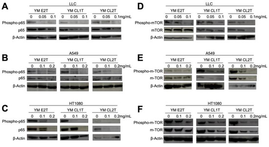 MASL inhibited NF-κB signaling, while modifying intracellular anti-apoptotic signaling in cancer cells. LLC (A,D), A549 (B,E), and HT1080 (C,F) cells were treated with the indicated MASL for 24 h. Cells were extracted and subjected to western blot analysis using anti-p65 and anti-phospho-p65 antibodies (A–C) and anti-m-TOR and anti-phospho-m-TOR antibodies (D–F).