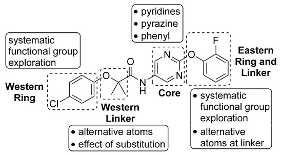 Recognizing that we lacked knowledge of the binding site of 10, which limits the utility of docking and structure-guided drug design approaches, we planned to execute a thorough parallel hit optimization approach in this series. We would endeavor to systematically prepare and test analogs with drug-like functional groups of varying electronic and steric character in four different regions of the scaffold (Figure 2). For example, in the western ring we planned to prepare analogs with such functional groups at each position of the aromatic ring. In the western linker, we planned to look at both the impact of substitution and the nature of the substituent. We also planned to evaluate alternative atoms within the linker. In the core, we planned to look at other six-membered ring aromatic alternatives to the pyrimidine, including pyrazine, phenyl, and pyridines. In the eastern region, we envisioned a similar systematic functional group substitution of the phenyl ring and replacement of the oxygen linker with alternative heteroatoms.