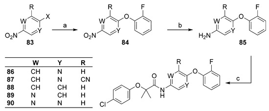 Finally, to prepare analogs that varied in the core of the scaffold, we followed a procedure analogous to that described above in Scheme 1 (Scheme 3). Specifically, we purchased five different halo-nitroarenes 83: 2-chloro-5-nitropyridine, 2-chloro-5-nitronicotinonitrile, 1-fluoro-4-nitrobenzene, 5-chloro-2-nitropyridine, and 2-chloro-5-nitropyrazine. Each of these monomers was reacted with 2-fluorophenol as described previously to generate the corresponding ether intermediates 84. Reduction of the nitro group provided the aryl amines 85, which were subsequently coupled with 2-(4-chlorophenoxy)-2-methylpropanoic acid using HATU to provide the target analogs 8690 as shown.