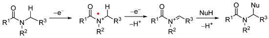 The electrochemical behavior of benzenesulfonamides has been widely investigated in the emerging field of wastewater technologies aiming at the elimination of antibiotics [29] and in the development of electroanalytical methods [30]. Under reductive electrochemical conditions, mild desulfonylation of amines can be carried out as a deprotecting strategy [31,32,33,34]. On the other hand, Shono oxidation is an anodic electrochemical oxidation in the course of which a new bond is formed in the α-position of an amino moiety between the carbon atom and the nucleophile applied in the reaction [35]. The reaction mechanism is illustrated in Scheme 1 on the example of carboxamides: they can be oxidized to N-acyliminium ions, and then these can be captured by various nucleophiles (Scheme 1).