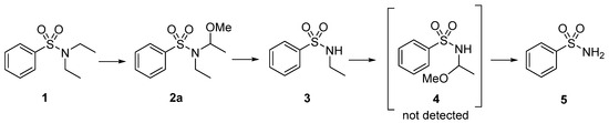 In our experiments, N,N-diethylbenzenesulfonamide (1) was used as the model compound under batchwise, controlled-current electrochemical conditions in an undivided cell at room temperature. The preliminary studies were carried out in a 10-mL vessel (containing 6 mL solvent) using an IKA ElectraSyn 2.0 Pro reactor in MeOH or MeOH-containing solvent mixtures. The supposed isolable products (monitored by LC-UV at 220 nm and by LC-MS) are shown in Scheme 4. It was presumed that the oxidatively coupled product (2a) is primarily formed, analogously to the mechanism depicted in Scheme 1. After hydrolysis of N,O-acetal 2a, monoethyl derivative 3 is obtained, which is then further transformed into another possible methoxy intermediate (4). The formation of the doubly dealkylated sulfonamide 5 as the final product was also expected. It is noteworthy, however, that in our experiments carried out under a wide range of conditions, compound 4 was never identified by LC-MS in the crude reaction mixtures, most likely due to its instability.