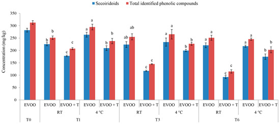 Concentration of secoiridoids and total identified phenolic compounds in fresh (T0) extra virgin olive oil (EVOO) and after one (T1), three (T3), and six (T6) months of storage with and without the addition of dry tomatoes (T) stored at room temperature (RT) and 4 °C. Results are presented as mean values ± standard deviations from three independent replicates, calculated as a sum of individual phenolic compounds of secoiridoids (3,4-DHPEA-EDA, oleuropein aglycones, ligstroside aglycones, p-HPEA-EDA). Columns labelled with a different letter within the single storage time (0, 1, 3 or 6) are statistically significantly different (Tukey’s test, p < 0.05).