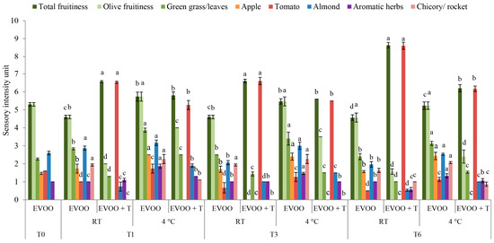 Odor attributes in fresh (T0) extra virgin olive oil (EVOO) and after one (T1), three (T3), and six (T6) months of storage with and without the addition of dry tomatoes (T) stored at room temperature (RT) and 4 °C. Results represent the mean values ± standard deviations of three repetitions. Different letters above bars within the same storage time (1, 3, or 6 months) are statistically different (Tukey’s test, p < 0.05) for each sensory attribute separately.