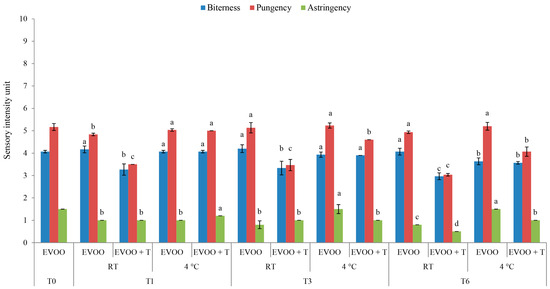Taste attributes in fresh (T0) extra virgin olive oil (EVOO) and after one (T1), three (T3), and six (T6) months of storage with and without the addition of dry tomatoes (T) stored at room temperature (RT) and 4 °C. Results represent the mean values ± standard deviations of three repetitions. Different letters above bars within the same storage time (1, 3, or 6 months) are statistically significantly different (Tukey´s test, p < 0.05) for each sensory attribute separately.