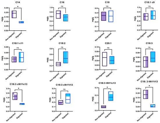 Effect of in vitro digestion on fatty acid quantitative profile. C14, myristic acid; C16, palmitic acid; C18, stearic acid; C18:1 c9, oleic acid; C18:1 c11, cis-vaccenic acid; C18: 2 c9c12, linoleic acid; C20:1, cis-gondoic acid; C18:3 c9c12c15, linolenic acid; C18:3 c9t11c13, punicic acid; C18:3 c9t11t13, α-eleostearic acid; C18:3 t9t11c13, catalpic acid; C18:3 t9t11t13, β-eleostearic acid; ns means no significant differences, and * means significant differences as determined by a one-way ANOVA test (p < 0.05).