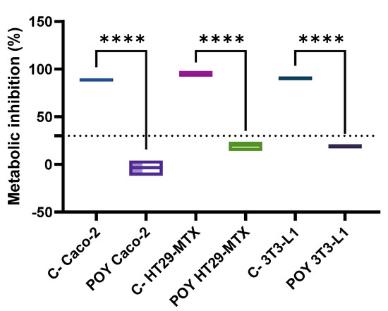 The cytotoxicity of the POY samples was assessed. As shown in the Figure 2 below, an inhibitory effect on cellular metabolism across all tested cell lines was observed. Additionally, when analyzing the effect of the POY sample on Caco-2 cell metabolism, an apparent metabolic stimulation was observed, indicated by negative values for metabolic inhibition, suggesting a metabolic activity higher than that of the growth control.