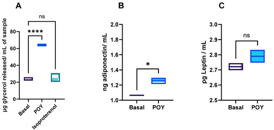 Effect of permeated pre-digested yogurt on lipolysis (A) and adipokine (adiponectin (B) and Leptin (C)) secretion in 3T3-L1 cells after 24 h of exposure. POY—pomegranate oil yogurt; ns means no significant differences, and * and **** means significant differences as determined by a one-way ANOVA test (p < 0.05 and p < 0.001).