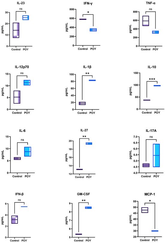 Cytokine production on the 3T3-L1 complex co-culture model basolateral side by the Caco-2/HT29-MTX membrane. POY—pomegranate oil yogurt; ns means no significant differences, and *, ** and *** means significant differences as determined by a one-way ANOVA test (p < 0.05, p < 0.01 and p < 0.001).