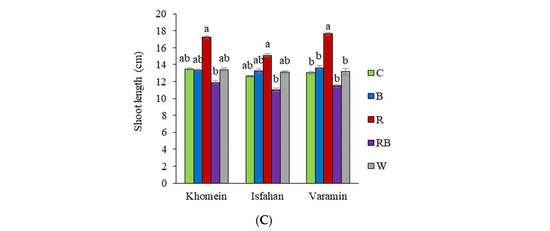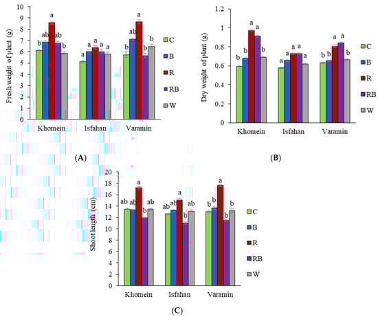 When exposed to R light, the fresh weight of the plants increased significantly in cultivars of Khomein and Varamin compared to the control light, but there was no statistically significant difference in the fresh weight of the Isfahan plants across light spectra compared to the control light (Figure 1A). The plants’ dry weight increased significantly under R and RB lights in the Khomein and Varamin cultivars compared to C, B, and W light. Furthermore, statistically significant differences were not observed in plant dry weight between the different LED light spectra with control light in the Isfahan cultivar (Figure 1B). The shoot length in Khomein and Isfahan cultivars significantly increased under R light treatment compared to RB light, while in the Varmin cultivar, all combinations of light were characterized by a shorter stem, except for R light (Figure 1C).