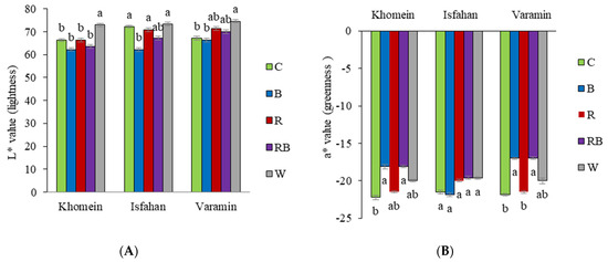 The b* color coordinate value, indicating blue + yellow opponents, shows that B light has negative values, while yellow has positive values [37]. The b* value tended to increment over capacity time, independent of light conditions, with the most noteworthy b* value seen in cultivars kept under W light for 9 days showing more articulated yellowing [34]. Tea leaves (cv. Hangjinya) exposed to a higher B light ratio exhibited a higher b* value (more yellow), possibly due to reduced levels of chlorophyll a, chlorophyll b, and the sum of chlorophyll a and chlorophyll b [38]. Similarly, the current study’s findings indicate an increase in the a* index in Khomein and Varamin cultivars under C, R, and W light, aligning with the results presented by Tian et al. [38].