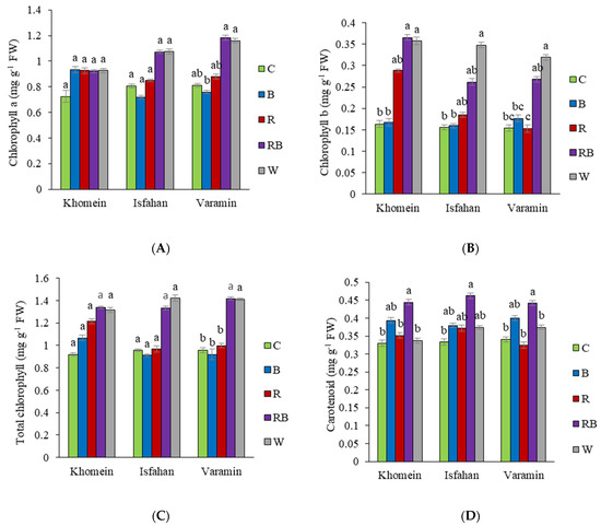 The Varamin cultivar showed a significant increase in chlorophyll levels under RB and W light compared to B light, which was not significantly different from the control light. In contrast, the Khomein and Isfahan cultivars showed no statistically significant change in chlorophyll across the different LED lights (Figure 3A). When exposed to RB and W light, chlorophyll b levels increased significantly in cultivar Khomein compared to C and B light, while in cultivars Isfahan and Varamin, chlorophyll b increased under W light compared to the control light (Figure 3B). The Varamin cultivar’s total chlorophyll increased under RB and W light. However, the Khomein and Isfahan cultivars demonstrated no significant variation in total chlorophyll under different LED lights compared to the control light (Figure 3C). The carotenoid concentration in the Khomein cultivar increased under RB light compared to C, R, and W light, while other light types did not show significant differences from the control treatment. In the Isfahan cultivar, carotenoid concentration increased under RB light compared to the control treatment. For the Varamin cultivar, the highest carotenoid concentration was observed under RB light, while the lowest was noted under the C, R, and W light spectra compared to RB light (Figure 3D).