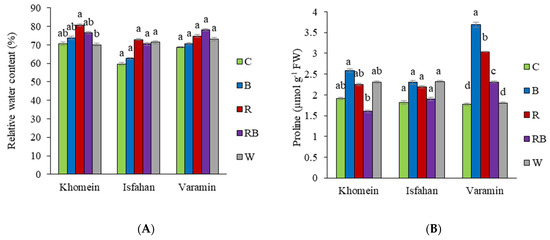 Sabzalian et al. [20] found that RB light significantly improved the relative water content (RWC) in mint and basil leaves. In [42], it was noted that RB light treatment led to increased leaf thickness and a higher percentage of intercellular spaces, which likely enhances water movement within the leaves, contributing to improved RWC. The increased resilience of the mesophyll’s airspace on water movement is thought to facilitate this enhancement, possibly due to the expansion of intercellular spaces [43,44,45]. In contrast, the present study found no significant improvement in RWC for the Isfahan and Khomein cultivars compared to the control group. This discrepancy might be attributed to several factors. One possibility is that the environmental conditions and experimental setups, such as light intensity, duration, and the specific growth stages of the plants, could have influenced the outcomes. It is also possible that the light spectra used in the current study did not provide the same beneficial effects on RWC as those observed in mint and basil, indicating a potential species-specific response to light treatments.