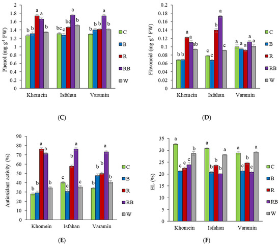 In the Khomein cultivar, RWC showed a significant increase under R light compared to W light, while there was no significant difference compared to C, B, and RB light. No statistically significant change in RWC was observed in the Isfahan and Varamin cultivars across the light spectrum (Figure 4A). The concentration of proline in the Khomein and Isfahan cultivars did not show significant differences compared to the control under various light spectrums. However, in the Varamin cultivar, proline levels increased under B light compared to the other light conditions (Figure 4B). The Isfahan and Varamin cultivars exhibited the highest phenol levels under RB light, while the Isfahan cultivar showed the lowest levels under C, B, and R light. Additionally, the Varamin cultivar did not show significant differences in phenol levels across the other light spectra. However, the Khomein cultivar produced the most phenol under R and RB light compared with C, B, and W light (Figure 4C). The Khomein and Isfahan cultivars had significantly higher flavonoid concentrations under R and RB light compared to the control light, but there was no statistically significant difference in flavonoid concentration in the Varamin cultivar in various light spectra compared to the control light (Figure 4D). Antioxidant activity in the Khomein and Varamin cultivars was higher under R and RB light compared to other light spectra. In particular, the Varamin cultivar exhibited significantly greater antioxidant activity under RB light than under the other light spectra, while no significant differences were observed among the other light spectra (Figure 4E). EL increased significantly in all three cultivars under C and W light, with the minimum recorded for B, R, and RB light (Figure 4F).