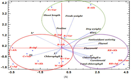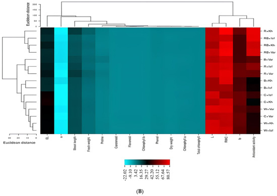 The heat map graph shows that among the traits studied, RWC, antioxidant activity, L* and b* index, EL, shoot length, and plant fresh weight were most affected by the treatments. The treatments had the smallest effect on the a* index, carotenoid, flavonoid, and chlorophyll b. The Isfahan and Varamin cultivars exhibited the greatest antioxidant potential when exposed to RB light, followed by the Khomein cultivars under R light. Furthermore, the lowest RWC was found in all three cultivars under the C light. All three cultivars showed an increase in the b* index under R light and C conditions. The antioxidant activity and the b* index were placed in separate clusters. The RWC and L* indices were also separated into their own clusters. RWC values were highest in the Khomein and Varamin cultivars under R and RB light and lowest in the Isfahan cultivar under C, B, and RB light. Under W light, all three cultivars exhibited the highest L* index values. Plant fresh weight and shoot length were separated and increased in the Khomein and Varamin cultivars under R light (Figure 5B).