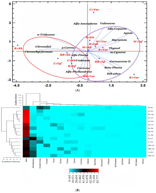 According to the PCA diagram, the exposure of the Isfahan cultivar to RB light increased the levels of α-copaene, apiole, thymol, m-cymene, β-pinene, dill ether, α-pinene, undecane, carvone, and α-pinene, as indicated by the purple circle (A group). Under RB light in the Khomein cultivar, α-pinene, undecane, carvone, α-phellandrene, citronellol, and citronellyl increased, as shown by the red circle (B group) (Figure 6A).