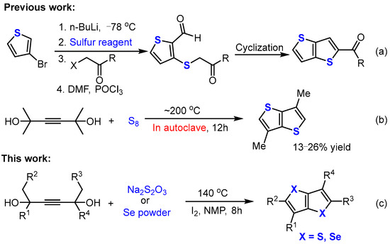 Feng, Y.; Zhang, X.; He, Z.; Zhao, M.; Chen, L.; Li, Y.; Luo, X. Expedient Synthesis of Substituted Thieno[3,2-b]thiophenes and Selenopheno[3,2-b]selenophenes Through Cascade Cyclization of Alkynyl Diol Derivatives. Molecules 2024, 29, 5507. https://doi.org/10.3390/molecules29235507