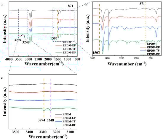 Comparison of infrared spectra of EPDM and spectra after modification; (a) infrared spectra comparison images of EPDM, EPDM-EP, EPDM-TF, and EPDM-DF; (b) enlarged image at 750–1600 cm−1; (c) enlarged image at 3050–3500 cm−1.