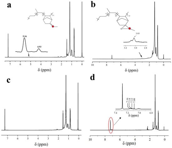 Figure 1 presents a comparative analysis of the infrared spectra of EPDM, EPDM-EP, EPDM-TF, and EPDM-DF. In Figure 1a,b, a peak at 810 cm−1 corresponds to the C=C double bond on ENB (effect of load on the stick–slip phenomenon and wear behavior of EPDM). Following the chemical interaction between EPDM and t-BuOOH, a new peak emerges at 871 cm−1 (Figure 1b), indicative of the antisymmetric stretching vibration of the epoxy C-O-C [12]. This observation confirms the successful epoxidation of the C=C double bond on ENB within EPDM. The peaks at 3294 cm−1, 3248 cm−1, and 1505 cm−1 in Figure 1b,c correspond to the stretching and deformation vibrations of the secondary amino group on DF, signifying the successful grafting of DF onto EPDM-EP [13]. However, the characteristic absorption peak of the imine group is absent in the infrared spectra, likely due to the relatively low reaction degree between TF and EPDM, resulting in a weak characteristic absorption peak of the secondary amino group that is not visible in the infrared spectra. Subsequent H-NMR analysis will further substantiate the successful reaction between EPDM-EP and TF (Figure 2).
