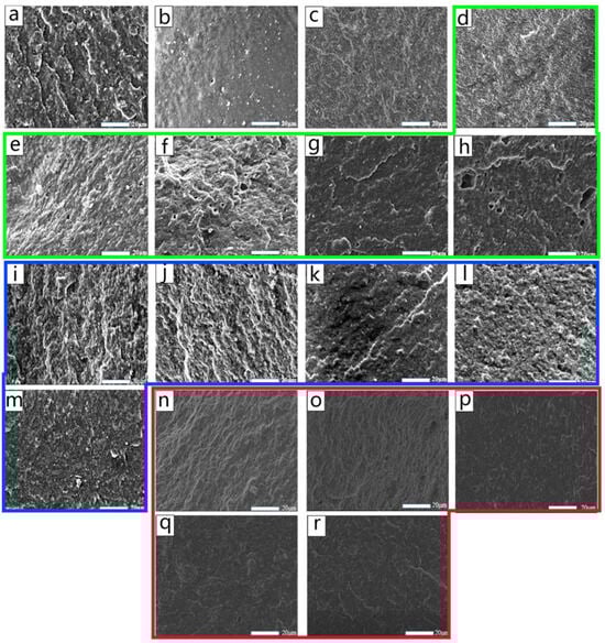 Cross-section SEM micrographs of FKM (a); EPDM (b); F/E (c); F/E/EPDM-EPy, y = 2, 4, 6, 8, 10 phr (d–h); F/E/EPDM-TFy, y = 2, 4, 6, 8, 10 phr (i–m); and F/E/EPDM-DFy, y = 2, 4, 6, 8, 10 phr (n–r).