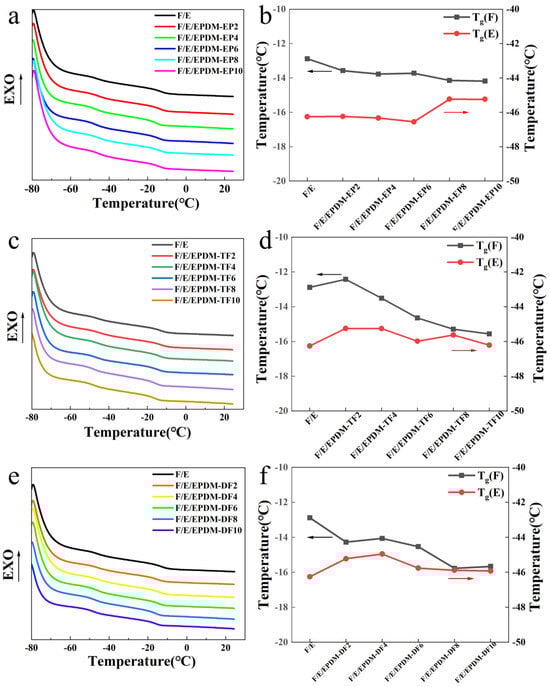 DSC curves of FKM/EPDM rubber blends incorporating EPDM-EPy (a); EPDM-TFy (c); and EPDM-DFy (e); respectively, y = 2, 4, 6, 8, 10 phr. Additionally, the variation in Tg of rubber blends with respect to EPDM-EP (b), EPDM-TF (d), or EPDM-DF (f) content. The arrow points to its corresponding vertical axis.