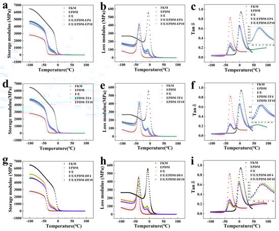 Storage modulus (a), loss modulus (b), and tan δ (c) of FKM, EPDM, F/E, F/E/EPDM-EP4, and F/E/EPDM-EP10; storage modulus (d), loss modulus (e), and tan δ (f) of FKM, EPDM, F/E, F/E/EPDM-TF4, and F/E/EPDM-TF10; storage modulus (g), loss modulus (h), and tan δ (i) of FKM, EPDM, F/E, F/E/EPDM-DF4, and F/E/EPDM-DF10.