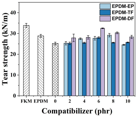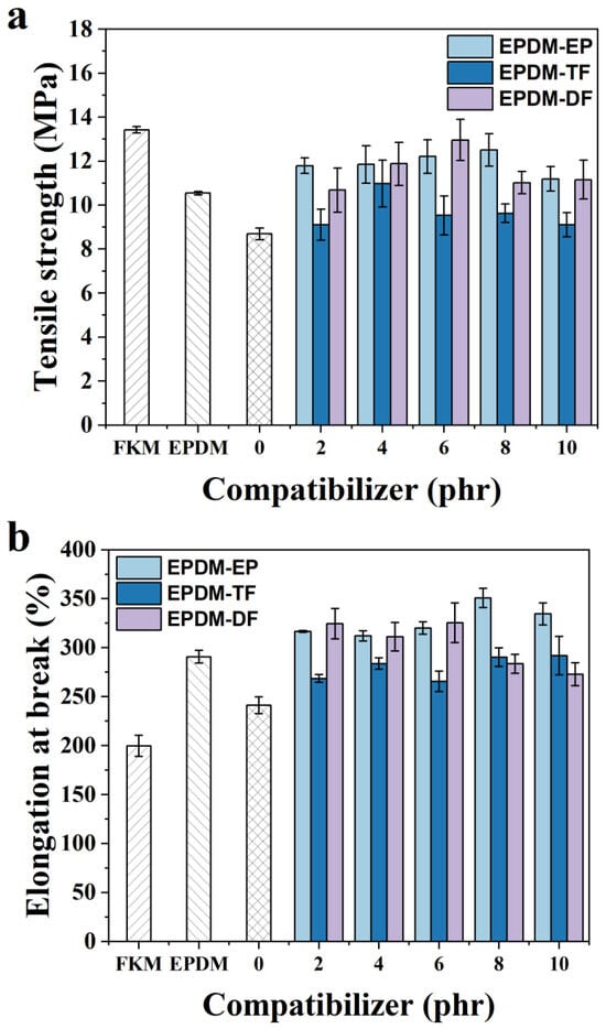 Figure 6a,b illustrates the comparative effects of incorporating three different compatibilizers on the tensile strength and elongation at break of the FKM/EPDM blends. As observed in Figure 6a, the addition of compatibilizers in various proportions has led to an enhancement in the tensile strength of the rubber. Specifically, the inclusion of 8 phr of EPDM-EP resulted in a tensile strength of 12.51 MPa for the FKM/EPDM rubber, which represents a 43.96% increase relative to the blend without EPDM-EP. Furthermore, the addition of 4 phr of EPDM-TF to the FKM/EPDM blend led to the maximum tensile strength, exhibiting a 26.35% improvement over the blend without any compatibilizer. Additionally, with the incorporation of 6 phr of EPDM-DF into the FKM/EPDM blend, the tensile strength reached its peak and increased by 49.14%. This can be explained by the fact that the compatibilizers facilitate better intermolecular interactions and a more uniform phase distribution, thereby enhancing the overall performance of the blend. When the amount of compatibilizer reaches a certain level, it effectively covers all interfaces that require improved compatibility. However, as the amount of compatibilizer continues to increase, there may be a point at which the compatibilizers can no longer efficiently cover the increased interfacial area or manage the interactions between the growing FKM or EPDM domains. Beyond a certain threshold, the additional compatibilizer may not provide significant improvements in compatibility and can lead to a leveling off or even a decrease in mechanical properties. This can occur due to over-modification or the introduction of unnecessary complexity in the blend, which can result in phase separation or the formation of larger microdomains that act as stress concentrators [18,19].