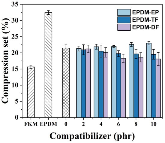 As depicted in Figure 8, it is evident that an increase in the content of either EPDM-TF or EPDM-DF leads to a decrease in the EN compression set rate of the FKM/EPDM blends. When 6 phr or more of EPDM-DF/TF is incorporated into the FKM/EPDM rubber, the EN compression set rate of the resulting blends ceases to decrease and remains relatively stable. The addition of 10 phr of either EPDM-TF or EPDM-DF results in a reduction of the blend rubber’s compression set by 1.92% and 3.35%, respectively, when compared to that of the FKM/EPDM blend without any compatibilizer. This improvement is attributed to the EPDM-DF/TF compatibilizers’ ability to enhance interfacial properties, increase stiffness, and ultimately improve the blend rubber’s resistance to external forces, as confirmed by SEM test results.