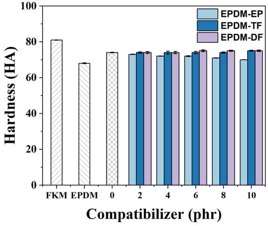 Figure 9 presents a comparative analysis of the hardness values of FKM, EPDM, and their respective blends following the incorporation of varying quantities of compatibilizers. An elevation in the EPDM-EP content is associated with a marginal reduction in the hardness of the blended rubber. Notably, the hardness of the blend only exhibited a 1 HA increase when 10 phr of EPDM-TF was introduced. In contrast, the addition of 6 phr of EPDM-DF led to a comparable 1 HA enhancement in hardness. The graphical data suggest that the inclusion of these three compatibilizers exerts a minimal influence on the overall hardness of the blended rubber.