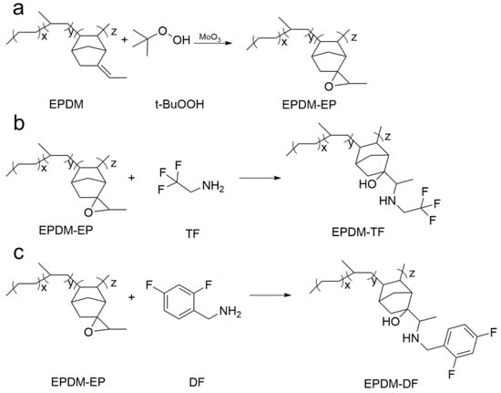 Schematic diagram of the EPDM epoxy modification reaction (a) and TF (b)/DF (c) grafted onto EPDM-EP.