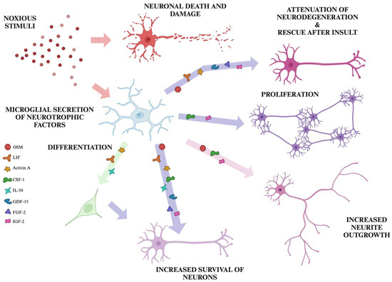 Microglia display phenotypic plasticity by altering their functions and morphology depending on their surrounding environment, including extracellular matrix, stimulants, inhibitors, and other cell types they encounter (reviewed in [7]). Under physiological conditions, surveying microglia typically exhibit ramified morphology and possess both primary and secondary surveillant processes. Pathological conditions such as those that develop in neurodegenerative diseases, neurotrauma, or infection provoke microglia to adopt a reactive phenotype characterized by amoeboid morphology with retracted processes, altered expression of membrane markers, and upregulated secretory activity (reviewed in [8]). Reactive microglia can exhibit overall pro-inflammatory or anti-inflammatory activity involving the release of distinct sets of molecules, which previously has been referred to as the M1 and M2 polarization, respectively; however, recent findings indicate that multiple intermediate and alternative to M1 and M2 functional states of microglia exist, compelling the scientific community to shift towards a multidimensional concept of microglial reactivity (reviewed in [9]). The microglial secretome is highly dependent on their phenotypic state. Under specific conditions, it may include a broad range of pro-inflammatory and neurotoxic molecules that contribute to neuronal death and the propagation of neuroinflammation (reviewed in [6]). Conversely, activation of inflammation-resolving pathways in microglia results in the release of anti-inflammatory and neurotrophic factors (reviewed in [10]). Our review illustrates that similar to their secretion of neurotoxins, reactive microglia are likely to secrete a mixture of neurotrophic molecules, the composition of which depends on the species, nature of the stimulating agent, and the surrounding microenvironment.