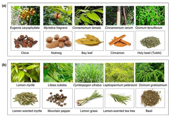 Natural sources of eugenol (a) and citral (b). The upper images indicate their scientific names and the lower images are common names.