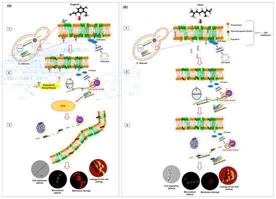 Proposed model for the anticandidal activity of eugenol and citral after short-term exposure. (a) We propose the anticandidal mechanism of eugenol as a simplified model showing (1) eugenol entering the cell membrane, causing membrane depolarization and ergosterol binding, with membrane defects leading to immediate cell cycle arrest at the G1/S phase. In (2), eugenol’s phenolic group facilitates its entry into the cytoplasm, disrupting ergosterol biosynthesis and protein trafficking, which triggers mitochondrial imbalance and the overproduction of ROS. (3) Loss of mitochondrial membrane function causes accumulation of intracellular ROS, which can damage nucleic acids, MTs, and the cell membrane and cause leakage of intracellular contents and cell death. (b) The proposed anticandidal mechanism of citral shows it (1) easily penetrating the cell membrane, causing membrane depolarization and immediate cell cycle arrest at the G1/S phase. (2) Once the cell membrane is saturated, citral passes into the cytosol where it preferentially partitions into MTs and vacuolar and mitochondrial membranes. (3) Loss of organelle membrane potential causes vacuolar segregation and disrupts the mitochondrial proton gradient, hampering the normal function of these organelles. On the other hand, association with MTs causes defects in cell separation and induces pseudohyphal growth.