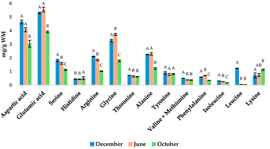 | Proteins | 7.99 ± 0.02 A | 6.76 ± 0.08 B | 6.38 ± 0.05 C |