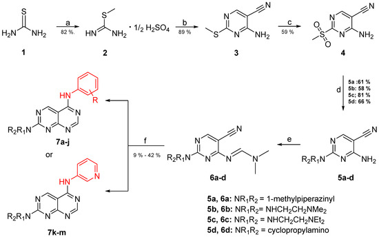 The synthesis of the pyrimido[4,5-d]pyrimidines is depicted in Scheme 1, with the substituents of the final derivatives shown in Table 1. Initially, the sulfate salt of 2-methyl-2-thiopseudourea (2) was prepared by treatment of thiourea (1) with dimethyl sulfate at 80 °C (Scheme 1). Subsequently, the reaction between 2-(ethoxymethylene)malononitrile and derivative 2, in the presence of triethylamine, afforded the desired pyrimidine 3, which, upon oxidization by meta-chloroperbenzoic acid, led to the formation of the oxidized compound 4. An aromatic nucleophilic substitution with various amines afforded the substituted pyrimidines 5a5d. Subsequent treatment with N,N-dimethylformamide dimethyl acetal (DMF-DMA) yielded intermediates 6ad. Finally, the desired pyrimido[4,5-d]pyrimidines 7a7m were obtained upon a nucleophilic addition by the appropriate aniline on the derivatives 6a6d, followed by a Dimroth rearrangement [32]. Structural elucidation of the compounds was confirmed through NMR spectroscopy, using both direct and long-range experiments. The 1H NMR spectra of the final compounds 7am display two characteristic singlets in the range of 9.0–9.5 ppm and 8.3–9.0, attributed to H-2 and H-5 of the pyrimido[4,5-d]pyrimidine scaffold, each integrating for 1 proton. It is noticeable that these compounds exist in solution in a tautomeric equilibrium. This was evident from the 1H-NMR spectra, where at least 2 tautomers were observed, especially with the compounds bearing a secondary amino substituted aliphatic side chain.