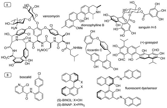 Known since the early works of Sandmeyer [1,2], Pschorr [3], and, a few years later, Ullmann [4], the biaryl motif is encountered in numerous natural products (Figure 1A). It can be found in secondary metabolites of various organisms. The most typical of these metabolites are the vancomycin family of antibiotics, well known for their ability to treat infections caused by bacteria that are resistant to other drugs; vancomycin has thus now been on the WHO’s list of essential medicines since 2017 [5,6]. The biaryl motif is also present in various plants in the form (i) of alkaloids, such as potent antimalarial dioncophyllines B and C [7,8]; (ii) of polyphenols, such as pluripotent riccardin C [9] and the ellagitannins sanguiins [10] and tellimagrandins [11]; or (iii) of toxic substances, such as gossypol [12] isolated from cotton seeds.