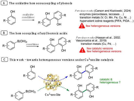 Known methods for biaryl synthesis via oxidative phenol homocoupling (A) [21] and aryl boronic acid homocoupling (B) [22,26], and the presently proposed alternative based on CuI-zeolite catalysis (C).