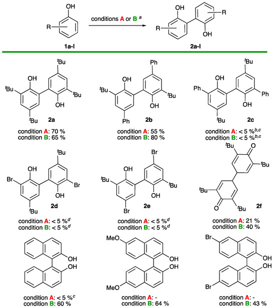 Compared to our model phenol, which dimerized to biphenol 2a with similar efficiency in methanol or water, its 4-phenylated analog gave the expected dimer 2b with better yield in water but lower yield in methanol. In contrast, its regioisomer led to a mixture of products from which the expected dimer 2c could be detected in only a low amount among various side products. Some of the latter may correspond to dibenzofuran derivatives, the formation of which being known from ortho-phenyl phenols under oxidative conditions [48]. The two brominated analogs behave similarly, providing again a complex mixture in which only low amounts of the expected dimers 2d and 2e were detected.