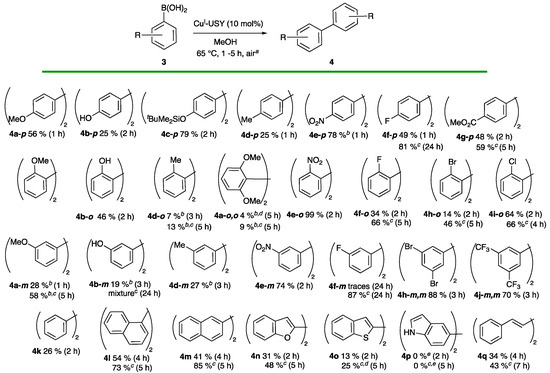 These results showed that CuI-USY is an active catalyst for the dimerization of 4-methoxyphenyl boronic acid 4a and that methanol is the best solvent, although it has been reported as deleterious in the classical CEL reaction [24], and that air is essential.
