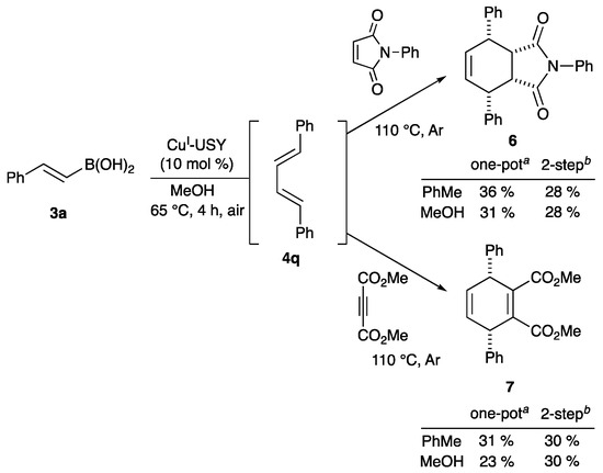 Alternatively, a new ligand- and base-free CuI-USY-catalyzed protocol was described for the homocoupling of (hetero)aryl- or vinylboronic acids. These heterogeneous conditions offered a mild and efficient access to a variety of biaryls under simple and practical conditions, i.e., refluxing in methanol, under air, and without any additive. The catalyst could be easily recovered and recycled three to five times. Applied to vinyl boronic acids, this mild homocoupling reaction readily produced dienes, which could directly be engaged in a Diels–Alder reaction. The two steps were also coupled together in a one-pot process.